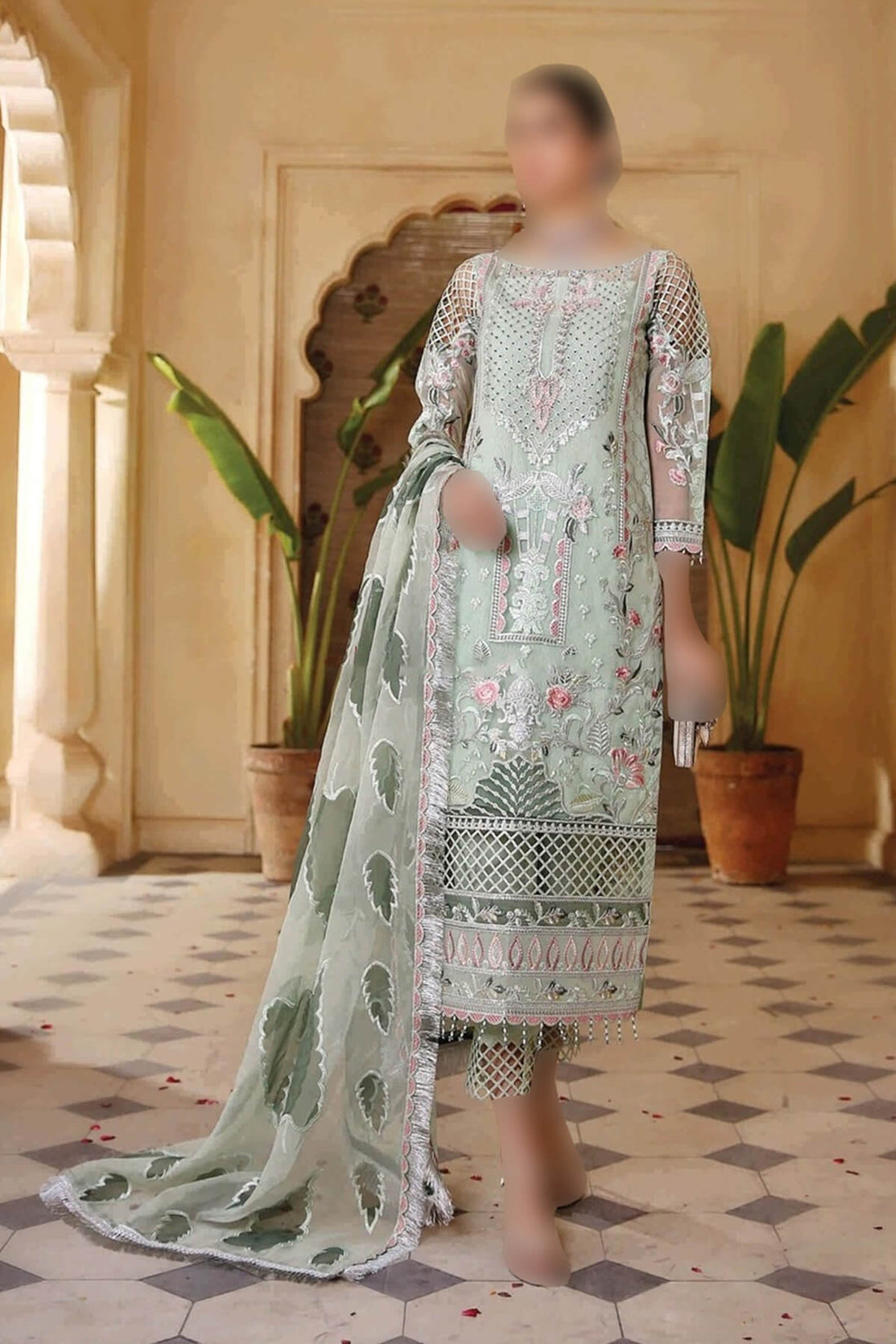 Front: 1 yard on organza, fully hand-madeBack (Embroidered): 1 yard on organzaSleeves: 0.75 yard, fully...